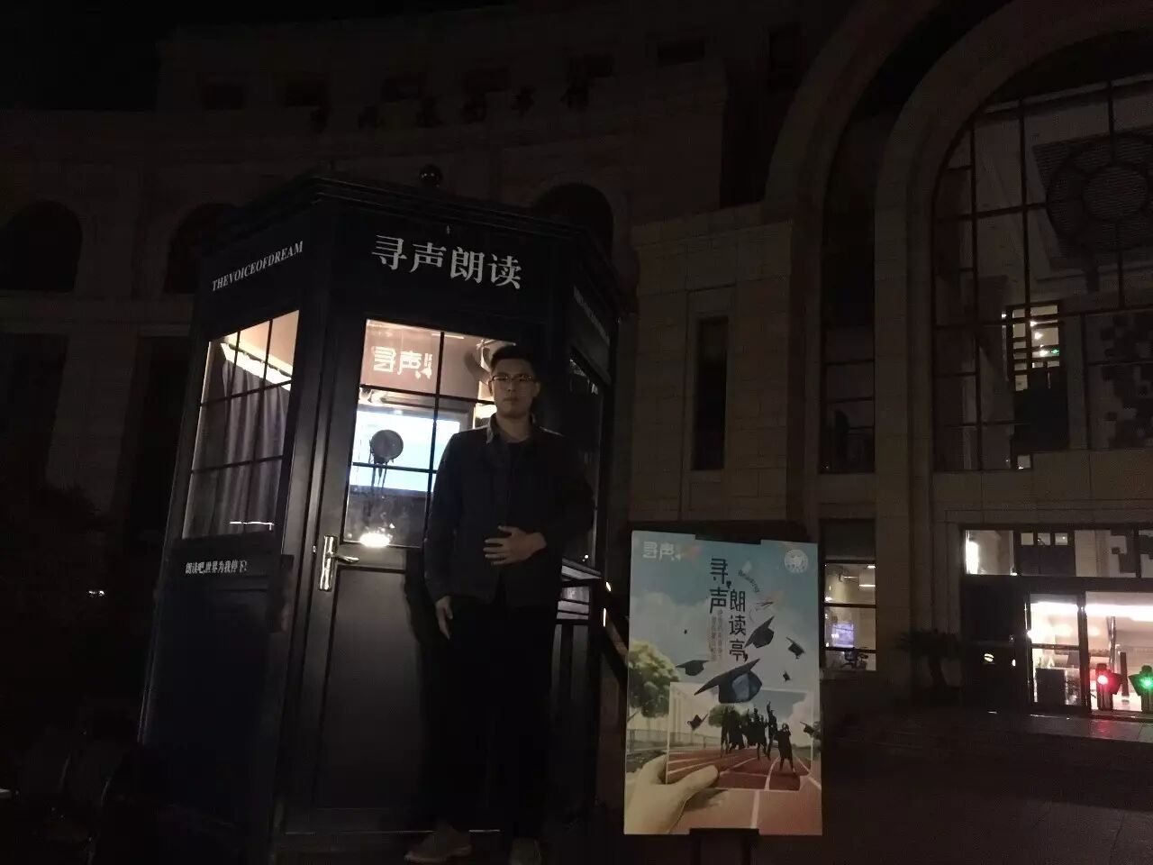 晚上八点钟,在复旦大学图书馆门口,最后一名寻声朗读亭体验者名字叫潘道新,今天是他的生日,他决定朗读一首诗作为给自己的生日礼物。